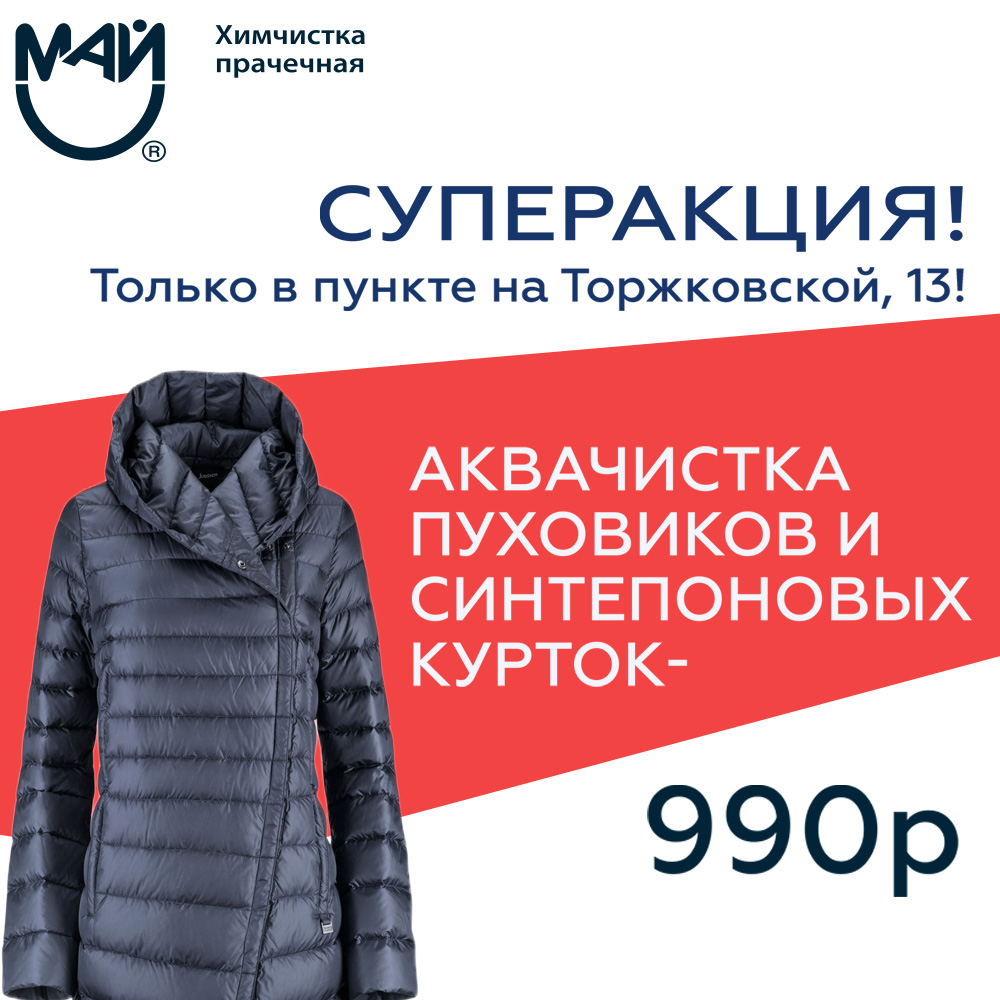 Акция действует на аквачистку слабозагрязненных пуховиков и утепленных курток любой длины, а также на аквачистку облегченных курток и синтепоновых и пуховых жилетов. Акция распространяется только на вещи, не требующие дополнительной ручной пятновыводки. Если вещь, в соответствии с ярлычком на ней, не может быть обработана при помощи технологии “Аквачистка”, то стоимость услуги будет рассчитываться в соответствии с базовым прейскурантом на услуги химчистки Май. Стоимость чистки опушки из натурального меха на капюшоне или манжетах пальто и пуховиков оплачивается отдельно и составляет - 400 р.